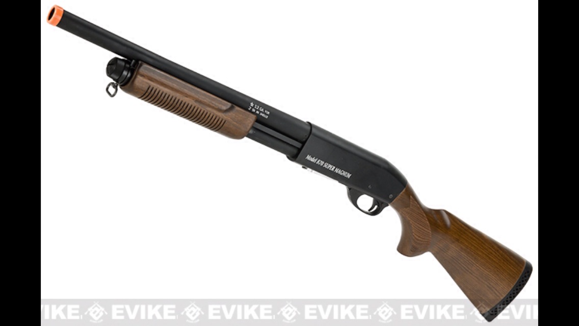 This is a spring action pump shotgun made by S&T. It features a full metal receiver and barrel and a full wood butt stock and fore-end. It very closely resembles a Remington m870 pump shotgun and has the weight and feel of the real thing. It utilizes a plastic magazine that is inserted below the receiver where you would load the shells in a real shotgun. I believe the magazine holds 40 6mm plastic bb’s although I haven’t fully loaded mine yet. Pump the fore-end and it fires one bb at a time. It’s quite powerful, I dont know the fps rating but Evike.com has this and all the specs on their website. I think it’s a pretty cool airsoft shotgun and even as a collectable or to hang on the wall it would be great. But it does shoot quite hard and wouldn’t doubt it hurts a good deal!